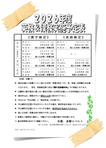 新着情報 《英検・漢検》「2026年度 検定の実施日」のお知らせ お知らせ 桜ヶ丘校 若葉台校 2026年02月03日(火曜日) 多摩ロベルトでの2026年度の漢検およびに英検の実施日をお知らせします。実施予定表はコチラ( pdf / 291KB)からダウンロードすることができます。 ※今年度より、当塾での準会場受験は当塾卒業生およびに在塾生とそのご家族のみとさせて頂きます。残念ながらマナーやルールが守れない方が多いため、一般の方の受付けを休止しています。ご理解のほど、よろしくお願いします(塾長)。 《高校受験》都立・国立・私立推薦入試、全結果が出そろいました